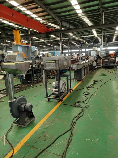 手動(dòng)閥用銅閘閥控制;加大水流量,2)采用環(huán)保風(fēng)冷卻系統(tǒng)(環(huán)保型:發(fā)明專利號(hào):CN201911312134.6)不需要接外循環(huán)水冷卻,不用徘外水;用閉環(huán)循環(huán)系統(tǒng)7.水循環(huán)真空泵;電機(jī)功率:3KW,真空泵采用環(huán)保冷卻系統(tǒng)(環(huán)保型:發(fā)明專利號(hào):CN201911312115.3)不需要接外循環(huán)水冷卻,不用徘外水;采用閉環(huán)循環(huán)系統(tǒng),節(jié)約水成本:功率:3KW真空泵8、液壓板式換網(wǎng):1)換網(wǎng)器,板式過濾自動(dòng)換網(wǎng)器,流量截面為圓形;2)液壓缸、液壓站等一套,采用YA-N46抗磨46#液壓油;(油品需客戶自行采購)9、機(jī)頭裝置:1) 熱電偶與壓力傳感器分開安裝,分別用于檢測溫度和壓力(三)水拉條輔機(jī) 1)水槽:一臺(tái),L=8米,加寬加深,槽體為不銹鋼材質(zhì);水槽與吸干機(jī)過度體一件;不銹鋼材質(zhì),水槽熱水經(jīng)過濾器到環(huán)保型冷卻器;水槽架里安裝:4組環(huán)保風(fēng)冷卻系統(tǒng)(環(huán)保型:發(fā)明專利號(hào):2020107265672)不需要接外循環(huán)水冷卻,不用徘外水;采用閉環(huán)循環(huán)系統(tǒng) 2)吹干機(jī):2套,功率2.2kw;與物料接觸件均為不銹鋼材質(zhì)。3)龍門切粒機(jī):壹臺(tái),功率11kw,變頻調(diào)速;切粒機(jī)動(dòng)刀刀口采用鎢鋼材質(zhì)4)加長振動(dòng)篩:工程塑料造粒代加工_工程改性料代加工_一臺(tái),L=2.5m,電機(jī)采用:震動(dòng)專用電機(jī);震動(dòng)量可以調(diào)節(jié)大小:電機(jī)功率率:0.55KW兩臺(tái);振動(dòng)篩篩網(wǎng)采用三層分離物料;大孔直徑φ8mm,小孔直徑φ2.5mm,不銹鋼材質(zhì),振動(dòng)篩出廠時(shí);振動(dòng)量調(diào)節(jié)到最小5)風(fēng)吹料倉:一套,1m料倉一件,不銹鋼材質(zhì);采用φ130mm不銹鋼管聯(lián)接;3kw物料輸送風(fēng)機(jī)。